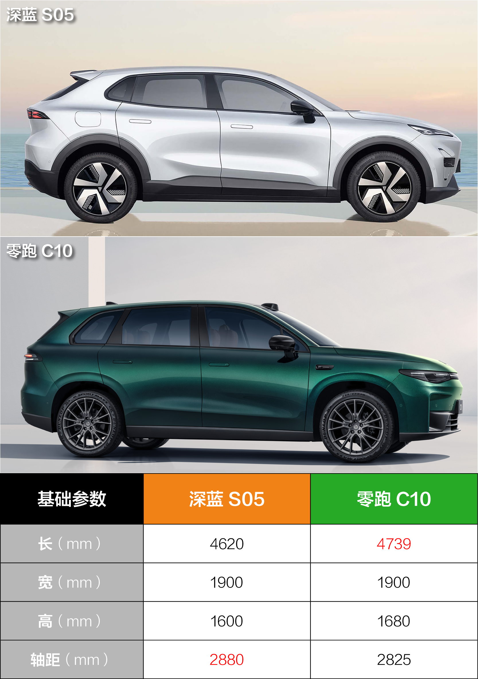 说到空间,实际上两车在级别上并不相同。零跑C10算中型SUV,深蓝S05在车身长度上要短11.9cm,被归为紧凑型SUV。别看车长短,轴距上深蓝S05反而比零跑C10还要长一些,可以说是物理意义上的“越级”,这对于提升前后排的腿部空间更有帮助。