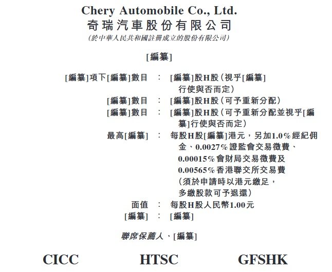 【大河财立方消息】9月7日,港交所显示,奇瑞汽车通过港交所上市聆讯,联席保荐人为CICC、HTSC、GFSHK。