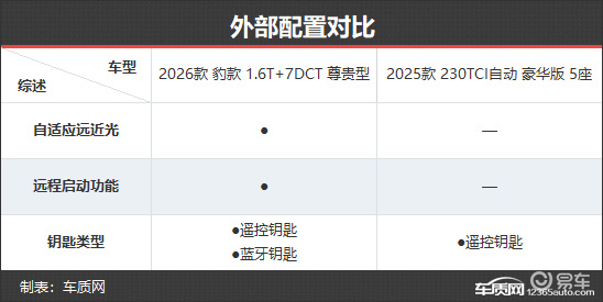 外部配置方面,新款车型相比老款车型再次得到提升,增加了自适应远近光功能,车辆可以判断路面对向车辆、人员情况,自动切换远近光灯,使驾驶员更专注于驾驶,提升行车安全性。此外,新款车型还增加了远程启动功能以及蓝牙钥匙,提升了日常用车的便利性。