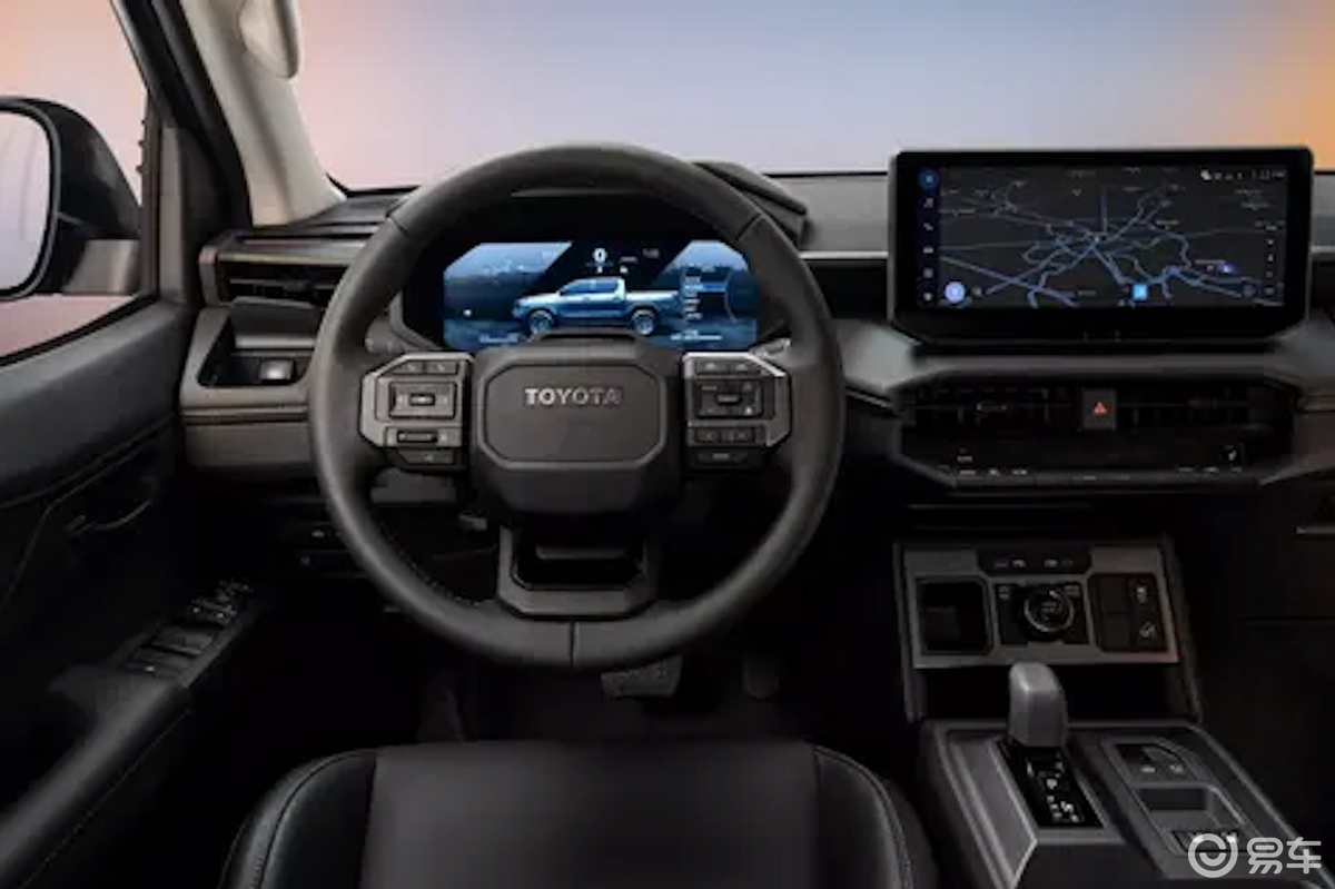 但车里的变化不小。两块12.3英寸的大屏成了标配,方向盘用的是和自家新陆巡同款的款式。副驾驶前面搞了个双层手套箱,中控台杯架也没缺席,这些小细节都在告诉用户——我可是台干活的工具车。