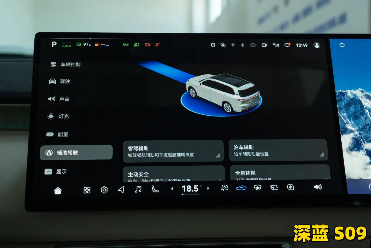 坐进车内,内饰实用性直接影响长途体验,两车中控屏设计差异明显。深蓝S09中控台布局简洁,主副驾配备双15.6英寸联屏,2.5K超高清视效,总显示面积略大于银河M9的30英寸中控屏,操作起来顺手且不遮挡驾驶视线。