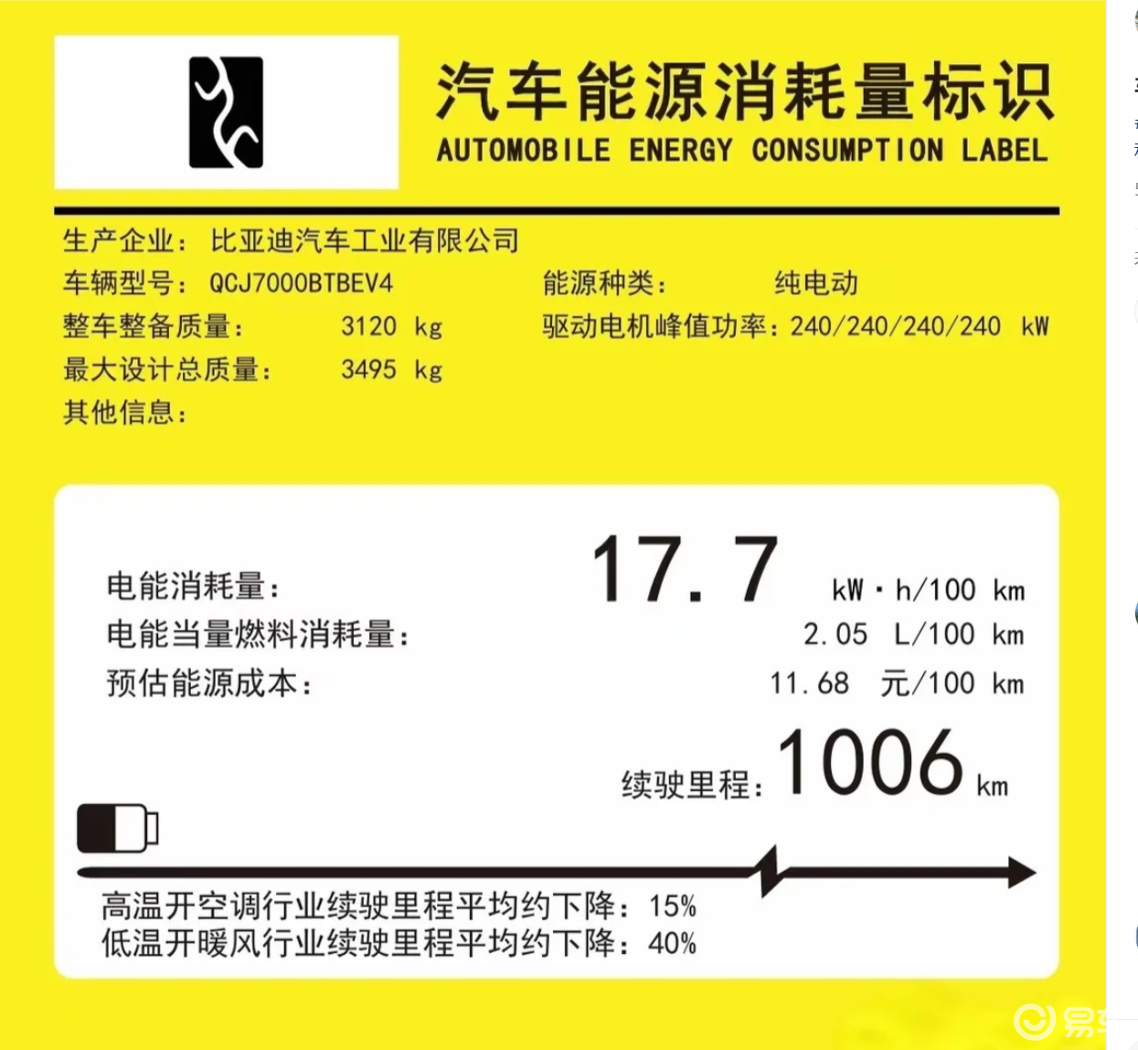 从曝光的标识信息来看,这款比亚迪全新纯电车型的硬实力堪称“六边形战士”。整车整备质量3120kg,最大设计总质量3495kg,搭配四台峰值功率均为240kW的驱动电机,动力性能拉满的同时,电能消耗量仅为17.7kW·h/100km,电能当量燃料消耗量2.05L/100km,折算下来每100km预估能源成本仅11.68元。低能耗与长续航的完美兼顾,背后离不开比亚迪在电池技术、电控系统等核心领域的深耕——作为新能源汽车行业的技术标杆,比亚迪的刀片电池、DM-i超级混动等技术已历经市场验证,此次千公里续航车型的推出,无疑是其技术积累的又一次爆发。