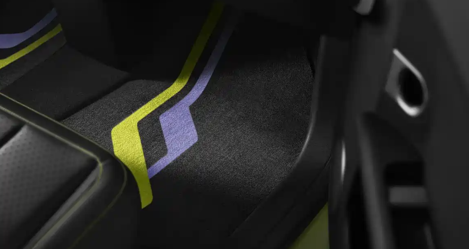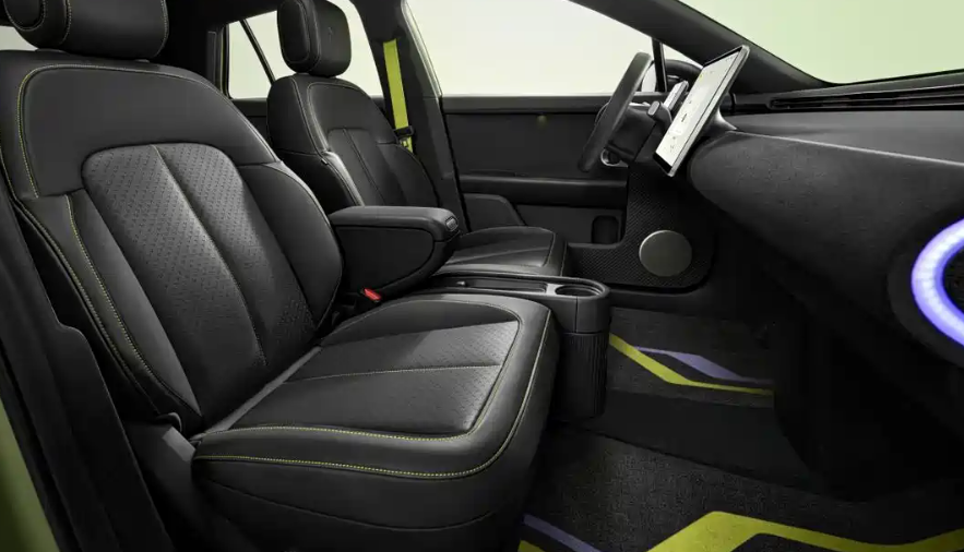内饰方面,该车采用「千禧之夜」主题设计,以沉静黑为基底,搭配黑色织物顶棚,细节处融入萤光绿安全带、座椅缝线及千禧频率定制脚垫,形成鲜明色彩碰撞。头枕LOGO采用高温凸印工艺打造立体纹理,细节之处尽显高级与专属感,为座舱营造沉浸式千禧潮流空间。