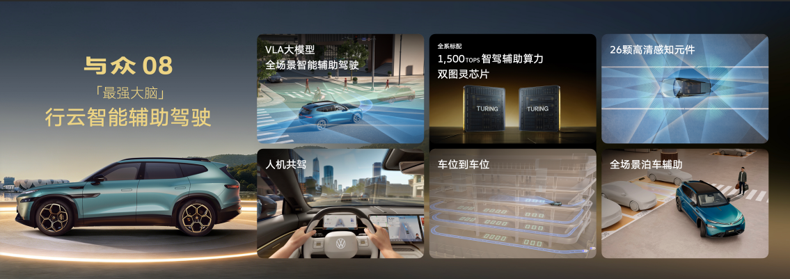 与众08的智能化水平,直接改写了合资纯电的竞争格局。它搭载双图灵AI芯片,总算力高达1500TOPS——是同级车型的三倍,为未来5年OTA留足算力冗余。全车26颗感知元件(11摄像头+3毫米波雷达+12超声波雷达),前视摄像头800万像素,弱光强光环境识别无压力。