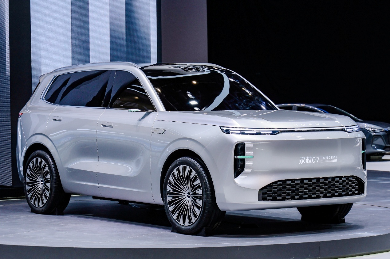家越07概念车从气场到细节,传递稳健和家庭温暖。近5米长的车身、高达1.2米的车头,搭配舒展有力的车顶线条、厚实挺立的D柱以及体块感强烈的形面语言,且正面及尾部皆呈现高而稳健的正梯形轮廓,呈现沉稳有力的整车形象。
