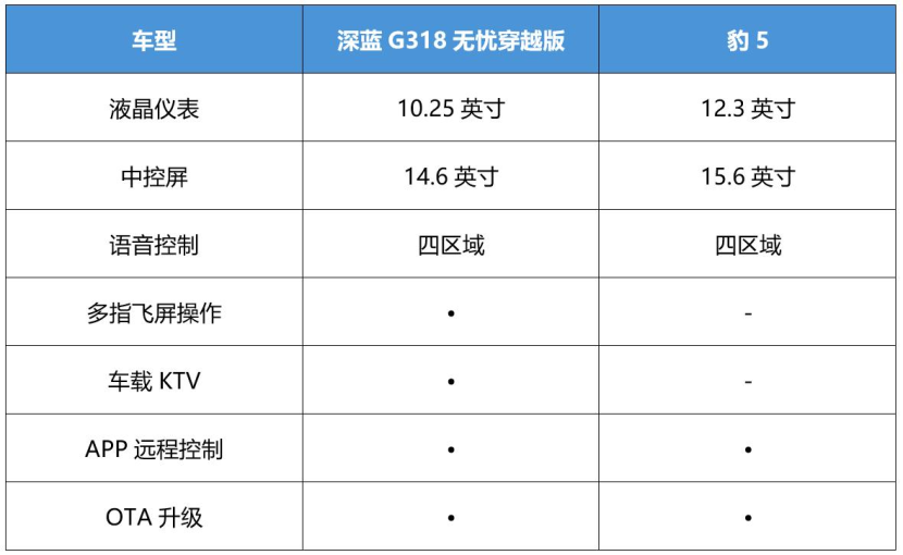 毫无疑问,智能座舱也是当下用户关注的点。可以发现,深蓝G318无忧穿越版和豹5在交互功能上都满足了需求,像语音控制、手机互联、APP远程控制等功能都提供了,而深蓝G318无忧穿越版还多了多指飞屏操控功能,让驾驶员能够更便捷、高效地操作车载系统,提升驾驶体验的安全性和舒适性。