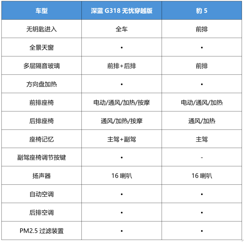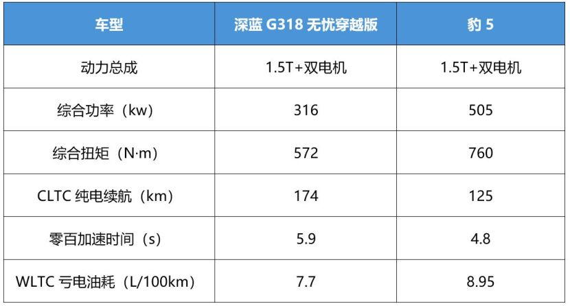可以发现,深蓝G318无忧穿越版和方程豹豹5都满足了用户对舒适、智能以及越野的需求。只是说,深蓝G318无忧穿越版在可玩性、经济性以及行驶表现上都更为突出,同时,作为一款中大型SUV,宽敞的座舱空间也会是加分项。重点是,此次对比的配置车型,豹5要贵了近1万元,所以从性价比的角度去看,深蓝G318无忧穿越版会是明智之选,大家觉得呢?不妨在评论区留言讨论。