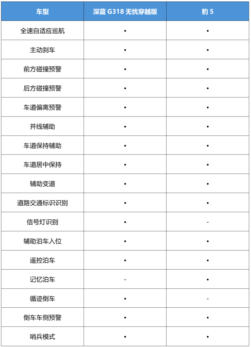 至于辅助驾驶层面,深蓝G318无忧穿越版和豹5都达到了L2级,像全速自适应巡航、主动刹车、前/后方碰撞预警、并线辅助等主流功能都配备了,同时,两者都具备智能泊车系统,便利之余也提升了新车司机的驾驶信心。